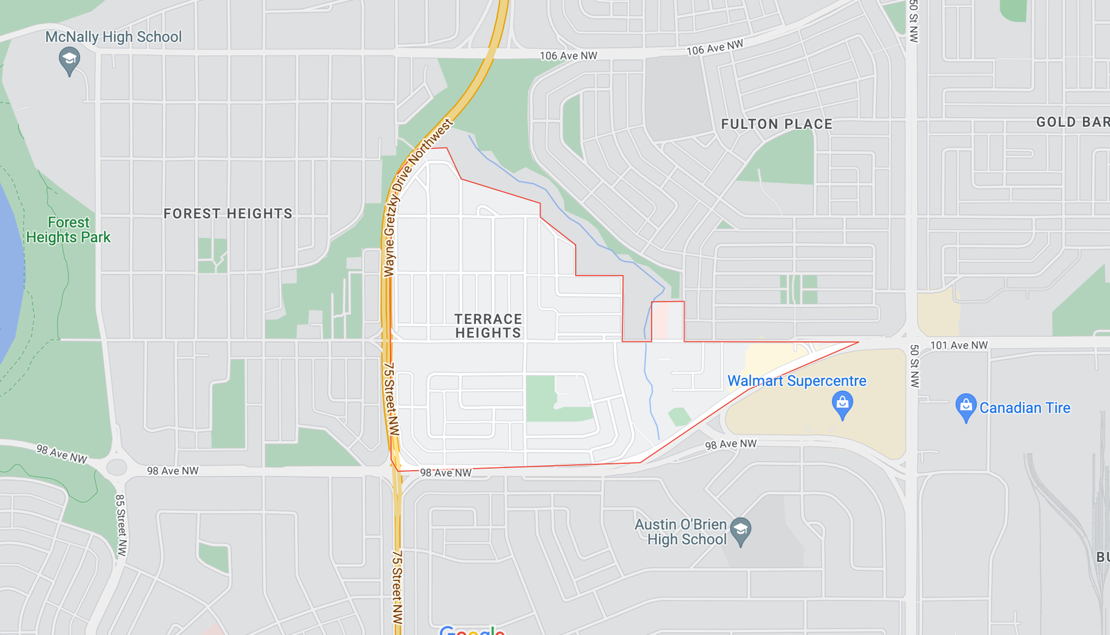 In effect, the Terrace Heights neighbourhood functions as two quiet, low-density residential areas, separated by the hustle and bustle of a high-density residential and commercial corridor along 101st Avenue. The neighbourhood has good road access to major shopping and employment centres, especially to the nearby Capilano Mall. The northern residential area is well-placed for residents' access to the Capital City Recreation Park system via the Capilano Ravine, which runs through the northeast side of the neighbourhood.